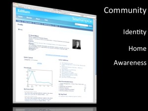 The final service is to help build community by putting the people back into the repository. This doesn’t have to be extreme, it doesn’t mean reinventing Facebook, instead you can build community through the sharing mechanisms of the repository itself by simply providing a profile page that gathers together all of one person’s efforts in the repository, and making sure that uploaders are aware of the activity (the attention metadata) around their items.