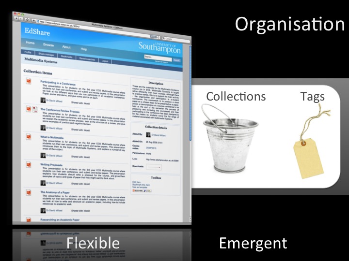Our key revelation in developing EdShare came several years ago when (after a few false starts) it became obvious that the traditional approach (digitally packaged teaching resources described using Learning Object metadata) was not working for everyday teachers. The overheads were huge, the upload process complex and the benefits to the people required to do the work (teachers and lecturers) unclear. This was 2007 and we asked ourselves how come people were prepared to upload photos and videos to emerging public sites like Flickr and Youtube, but they couldn’t be bothered to share their teaching resources. What do those sites offer that teaching and learning repositories don’t?