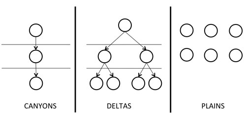 In our new paper we point out that there are three basic models of location-based systems: Canyons – a sequence of nodes/locations that must be visited in turn, Deltas – a tree of nodes/locations, where each user choice moves you down the tree and offers up new choices, and Plains – a set of nodes/locations that can be explored in any order. We then show that a simple model of sculptural hypertext can not only represent all three models, but mix them up into hybrid structures (such as a canyon that opens out into a plain).