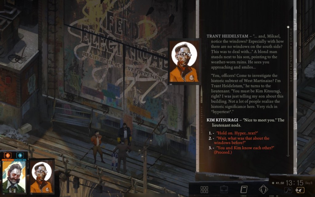 I’m not sure that philosophical arguments with racial supremacists was exactly what the early hypertext researchers had in mind, but otherwise these interactions are classic adaptive hypertexts. Perhaps the developers had this in mind during this conversation with Trant Heidelstam – special consultant to Revachol Citizens Militia – “rich in hypertext” indeed.