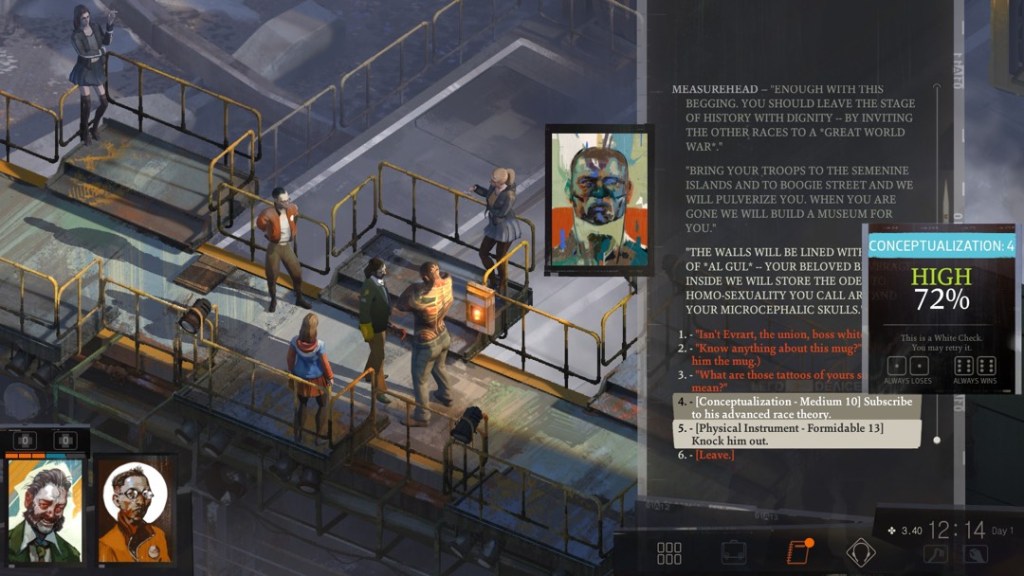 Certain choices within these trees will resolve differently based on a skills check, effectively an adaptive outcome based on a probabilistic check against the user model. However, in classic hypertext systems this mechanism is hidden from the reader. Disco makes the calculation scrutable, showing you the number you need to exceed on a virtual d20 dice roll, and classifying it as a Low, Medium, or High chance. For example, in the scene with Meathead you have the option to sign up to his ideology (giving you a new thought for your cabinet), but it requires a Conceptualisation check – and the game gives you all the stats including your percentage chance of success. In addition checks are colour coded, those that can be retried are white, but those that are one-chance-only are red.